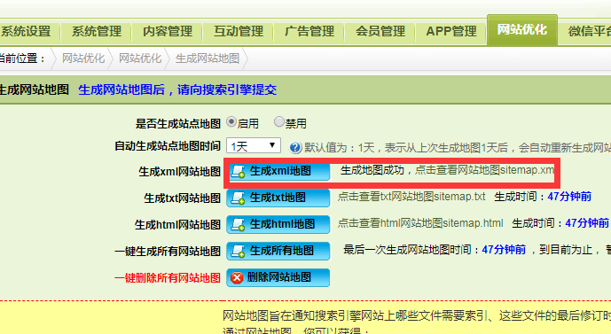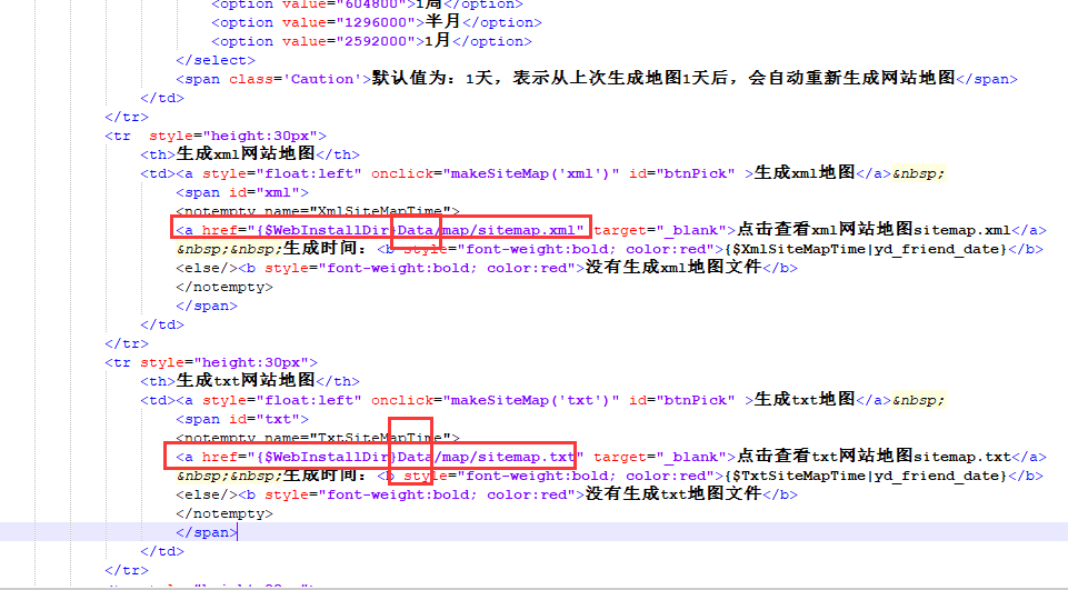 網(wǎng)站優(yōu)化中的目錄地址也可以修改下地址:AppTplAdminDefaultSeo sitemap.html 這個(gè)里面的路徑,可以改下測(cè)試