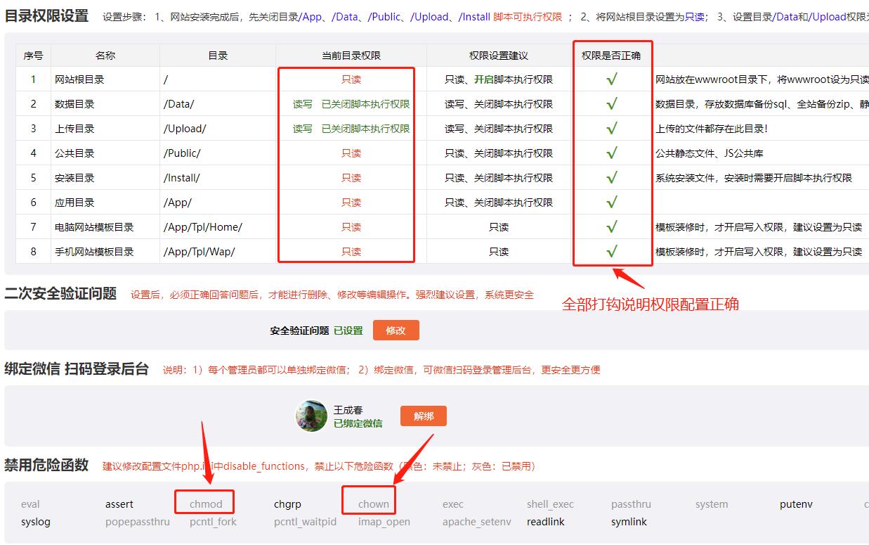 設(shè)置完成以后,登錄網(wǎng)站管理后臺,依次進入【設(shè)置】-【安全設(shè)置】,檢查權(quán)限是否設(shè)置成功,表格【權(quán)限是否正確】顯示設(shè)置是否成功,如下圖所示: