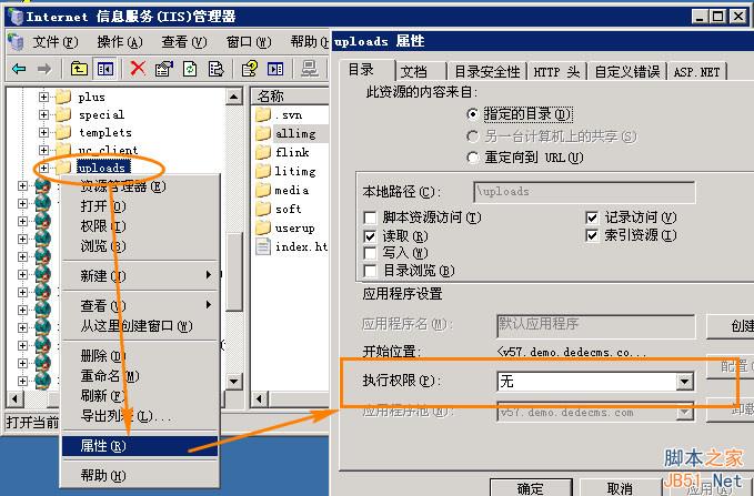打開(kāi)IIS中站點(diǎn),在站點(diǎn)Upload目錄點(diǎn)擊右鍵,菜單中選擇“屬性”,在目錄屬性面板選擇執(zhí)行權(quán)限為“無(wú)”即可。如下圖所示:
