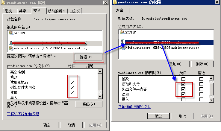 打開(kāi)網(wǎng)站的目錄,右鍵單機(jī)網(wǎng)站跟目錄,選擇【屬性】,選擇網(wǎng)站對(duì)應(yīng)的訪問(wèn)賬號(hào),然后點(diǎn)擊【編輯】按鈕,根據(jù)需要來(lái)設(shè)置是否選擇寫入權(quán)限,如下圖所示: