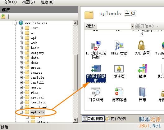 IIS7也類似于IIS6.0,選擇站點(diǎn)對(duì)應(yīng)的目錄,Upload文件目錄,雙擊功能試圖面板中的【處理程序映射】,如下圖所示