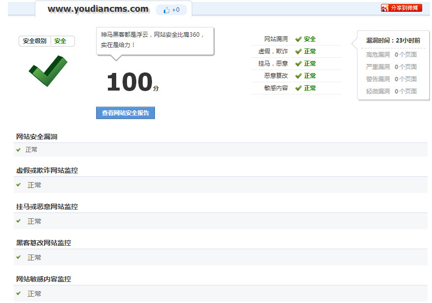 》經(jīng)過研發(fā)團(tuán)隊不停地完善,成功通過360網(wǎng)站安全在線檢測,沒有發(fā)現(xiàn)任何漏洞,得滿分