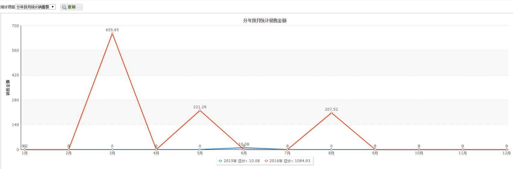 在后臺互動管理——》訂單管理里的銷售統(tǒng)計里可查詢銷售統(tǒng)計圖表,可以按天統(tǒng)計當(dāng)月銷售額,也可分年按月統(tǒng)計銷售額,還可查詢銷售排行榜和銷售業(yè)績。