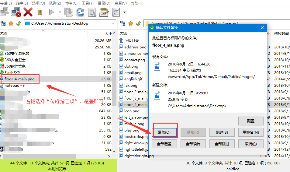 選擇傳輸指定的文件,然后覆蓋確定即可