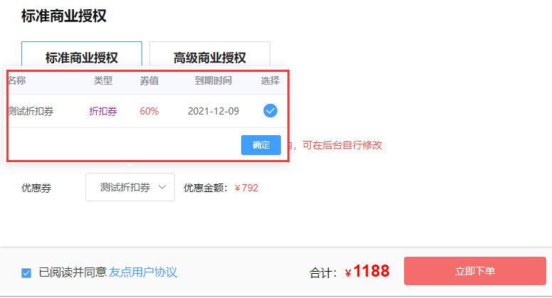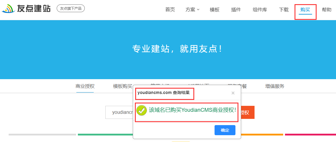 授權(quán)購買成功后,可在友點官網(wǎng)——》購買——》商業(yè)授權(quán)里,查詢是否授權(quán)成功。